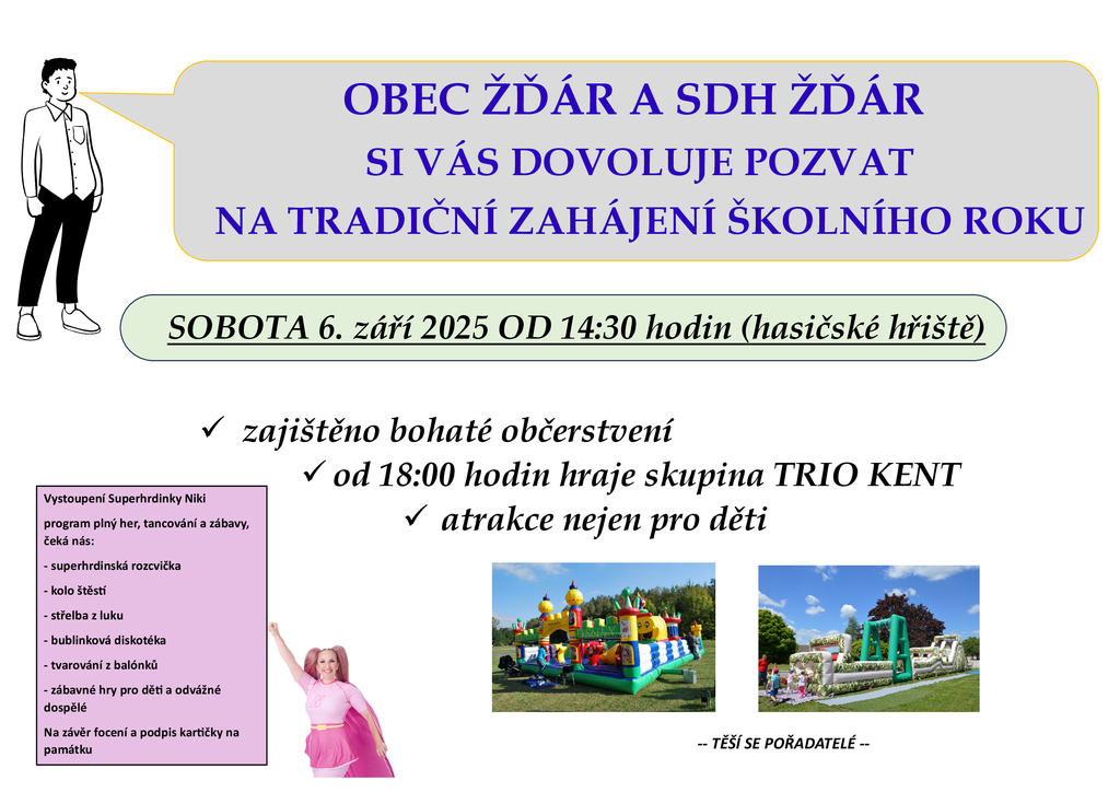 Pozvánka na již tradiční "ZAHÁJENÍ ŠKOLNÍHO ROKU". Program doplněn o vystoupení (od 15:00 do 16:30 hodin) Superhrdinky Niki - superhrdinská rozcvička, kolo štěstí, střelba z luku, bublinková diskotéka, tvarování z balónků, zábavné hry pro děti a odvážné dospělé a na závěr focení a podpis kartičky na památku.