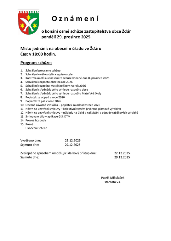 Veřejné zasedání zastupitelstva obce 29.12.2025