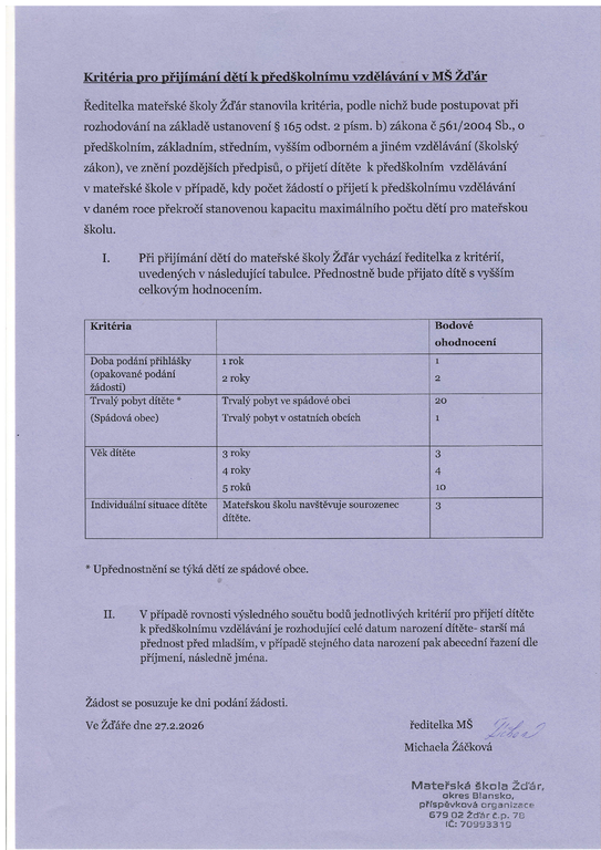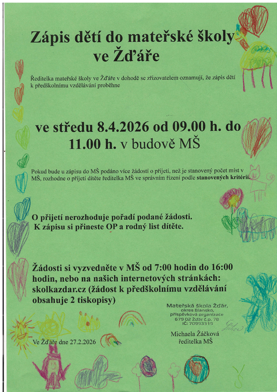 Informace k zápisu dětí do mateřské školy Žďár 2026